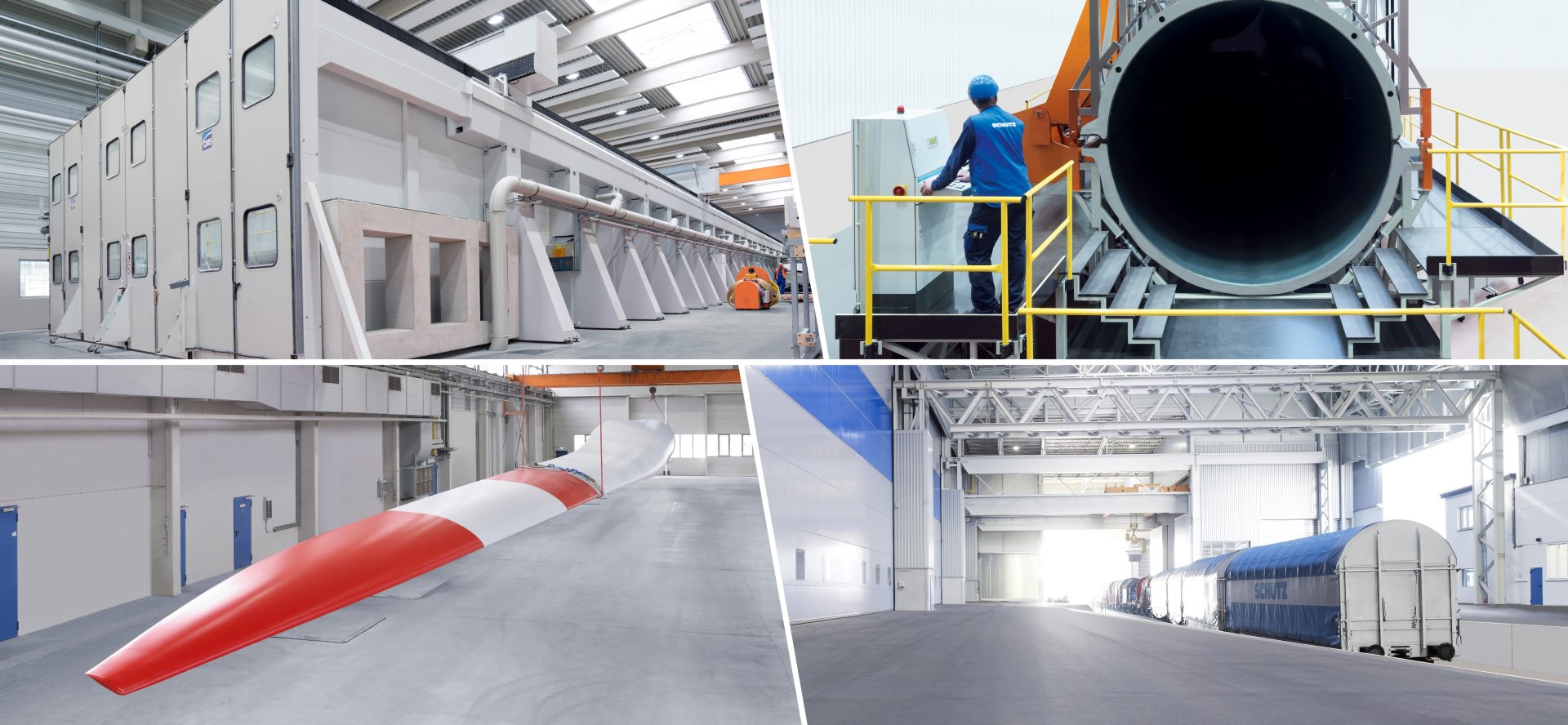 Wie alle Bereiche der SCHÜTZ Unternehmensgruppe entwickelt und produziert auch SCHÜTZ COMPOSITES in einer perfekten Infrastruktur. Eigens für die Windkraft wurde ein 32.815 m² großer Hallenkomplex geschaffen, in dem alle Fertigungsschritte unter einem Dach abgebildet werden.